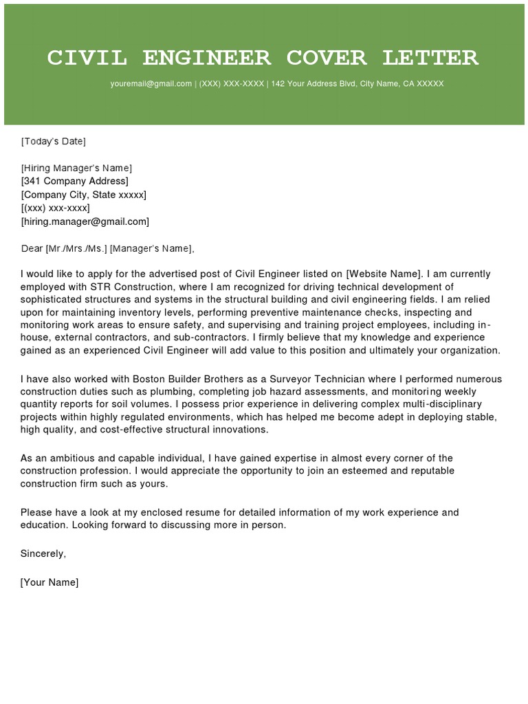 Civil Engineer Cover Letter 2018 Green Docx Employment Civil